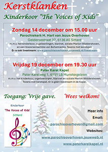 beschrijving | ![]() Het kinderkoor ‘The Voices of Kids’ verzorgt dit jaar twee kerstconcerten om samen in de kerststemming te komen. De concerten vinden plaats op zondag 14 december in Sittard en vrijdag 19 december in Munstergeleen. Zondag 14 december - 15.00 uur - Sittard Vrijdag 19 december - 19.30 uur - Munstergeleen U bent van harte welkom bij onze kerstconcerten, zowel op zondag 14 december alsook op vrijdag 19 december. De toegang is een vrije gave om de onkosten van de concerten te kunnen dekken.