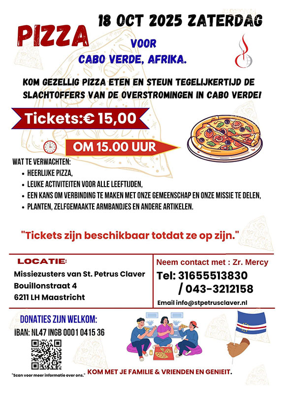 beschrijving | ![]() Op zaterdag 18 oktober organiseren de Missiezusters van St. Petrus Claver in Maastricht een feestelijke ontmoetingom geld in te zamelen voor de slachtoffers van de overstromingen in Cabo Verde. Overstromingen Programma