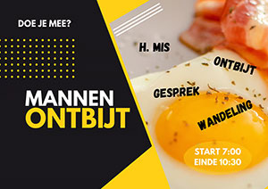 De H. Gerardus Majella Parochie te Utrecht organiseert elke zes weken op een zaterdagochtend het mannenontbijt. Deze activiteit duurt tot ongeveer half elf. Veel van de deelnemers hebben op zaterdag ook nog allerlei klussen te doen en dat is hierdoor prima mogelijk. Het doel is om ons als parochiaan in te zetten de vriendschap met Christus te verdiepen en te delen met elkaar, en om zo missionaire leerlingen te worden. Dit kan niemand alleen, daarom onder andere deze activiteit. Het blijkt heel inspirerend om samen over het geloof te praten, toegepast in ons dagelijks leven.