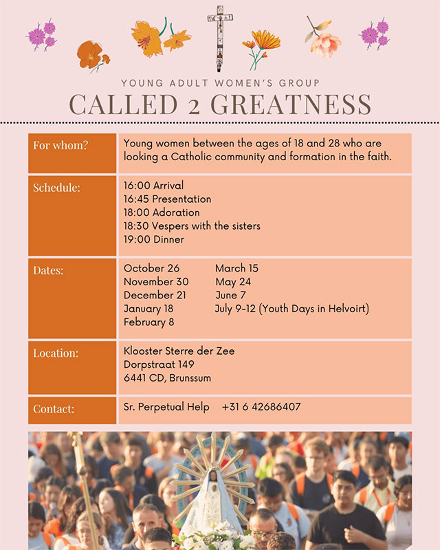 For any young women in the Limburg area interested in learning more about the faith (whether you know nothing at all or have been Catholic your whole life and want to deepen your knowledge) and are looking for a Catholic community, we will be continuing with our young adult women’s group! The meetings will be once a month on Sunday in our convent in Brunssum. We speak a mix of English and Dutch at the events.