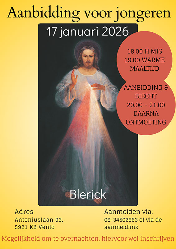 De volgende aanbidding voor jongeren wordt gehouden op zaterdag 17 januari 2026 in de Antoniuskerk te Blerick.