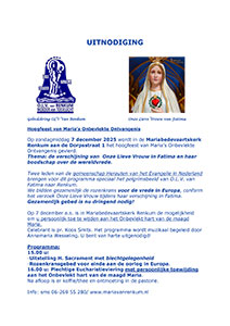 Op zondagmiddag 7 december 2025 wordt in de Mariabedevaartskerk Renkum aan de Dorpsstraat 1 het hoogfeest van Maria’s Onbevlekte Ontvangenis gevierd. Thema: de verschijning van Onze Lieve Vrouw in Fatima en haar boodschap over de wereldvrede. Pelgrimsbeeld We bidden gezamenlijk de Rozenkrans voor de vrede in Europa, conform het verzoek Onze Lieve Vrouw tijdens haar verschijning in Fatima. Gezamenlijk gebed is nu dringend nodig! Op 7 december is in Mariabedevaartskerk Renkum de mogelijkheid om u persoonlijk toe te wijden aan het Onbevlekt Hart van de maagd Maria. Celebrant is priester Koos Smits. U bent van harte uitgenodigd! Programma 15.00 uur 16.00 uur Na afloop is er koffie/thee en ontmoeting in de pastorie.