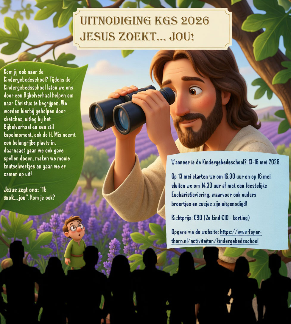 Van woensdag 13 t/m zaterdag 16 mei wordt in de Foyer te Thorn weer een Kindergebedsschool gehouden voor kinderen van groep 4 t/m 8. Een uitgebalanceerd programma met catechese en gebed, spel en gezelligheid, om de kinderen te brengen tot een persoonlijke ontmoeting met Jezus. O.l.v. Foyer met vrienden. Op woensdag 13 mei starten we om 16.30 uur en op 16 mei sluiten we af met een feestelijke Eucharistieviering waarvoor ook ouders, broertjes en zusjes zijn uitgenodigd! Richtprijs: € 90 (2e kind € 10 korting) Opgave via de website