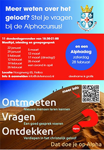 De Alpha cursus wordt georganiseerd op donderdagavond (18.30 - 21.00 uur) vanaf 22 januari. De avonden zijn inclusief maaltijd en deelname is gratis, al is een donatie altijd welkom.