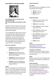 In acht dinsdagavonden maken we kennis met de spiritualiteit van Teresa. We gebruiken hiervoor een bijzondere insteek: de bekroonde Spaanse filmreeks over haar leven (met Nederlandse ondertiteling). De film dient als startpunt om, samen met haar werken De Innerlijke Burcht en haar Autobiografie, te leren hoe we vertrouwd kunnen raken met het inwendig gebed.