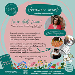 Op zaterdag 31 janauri 2026 vindt in Roermond het Limburgs Liefste Event plaats. Start samen met ons 2026 vol Hoop en beleef samen met tientallen andere vrouwen van 18-88 een dagvullend programma met ontmoeting, inspirerende sprekers en workshops, gebed, bezinning, muziek en stilte. Uiteraard incl. koffie & thee, een gezellige lunch en tussendoortje!