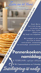 Op zondag 8 februari tussen 14.30 en 18.30 uur houdt de Gemeenschap Zaden van het Woord een ‘Pannenkoeken Namiddag’ in Tongeren. Zoals Maria het Licht droeg, zo worden wij gedragen door liefde. Dilexit nos - Hij heeft ons liefgehad. Iedereen is uitgenodigd om dit Licht te delen, rond warmte, ontmoeting en eenvoudige pannenkoeken. Bijdrage: € 10 voor twee pannenkoeken en een drankje Inschrijving is nodig.
