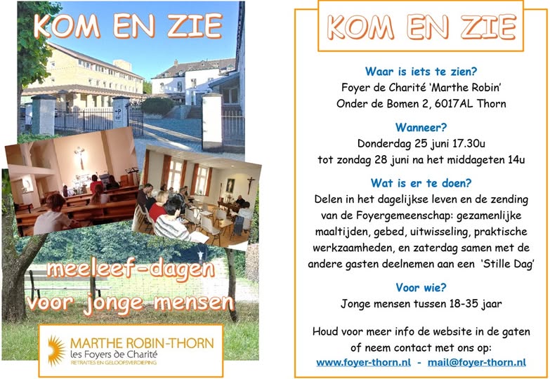 Van donderdag 25 t/m zondag 28 juni houdt Foyer Marthe Robin in Thorn weer meeleefdagen: delen in het dagelijkse leven en de zending van de Foyer-gemeenschap: gezamenlijke maaltijden, gebed, uitwisseling, praktische werkzaamheden en zaterdag met de andere gasten deelnemen aan een Stille dag. Voor wie? Voor jonge mensen van 18-35 jaar.