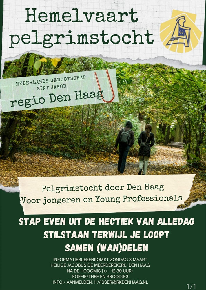 Het Nederlands Genootschap Sint Jakob, regio Den Haag organiseert op Hemelvaartsdag 14 mei een Hemelvaart Pelgrimstocht door Den Haag voor jongeren en Young Professionals.
