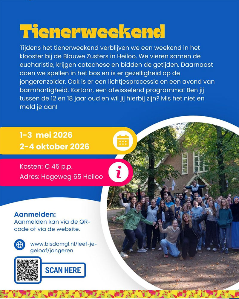 Twee keer per jaar wordt er voor tieners tussen de 12 en 18 jaar een tienerweekend georganiseerd bij de blauwe zusters in het klooster van Heiloo.
