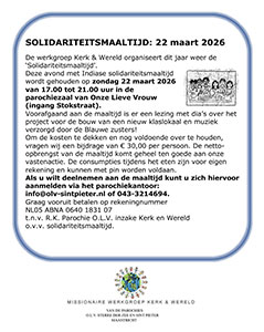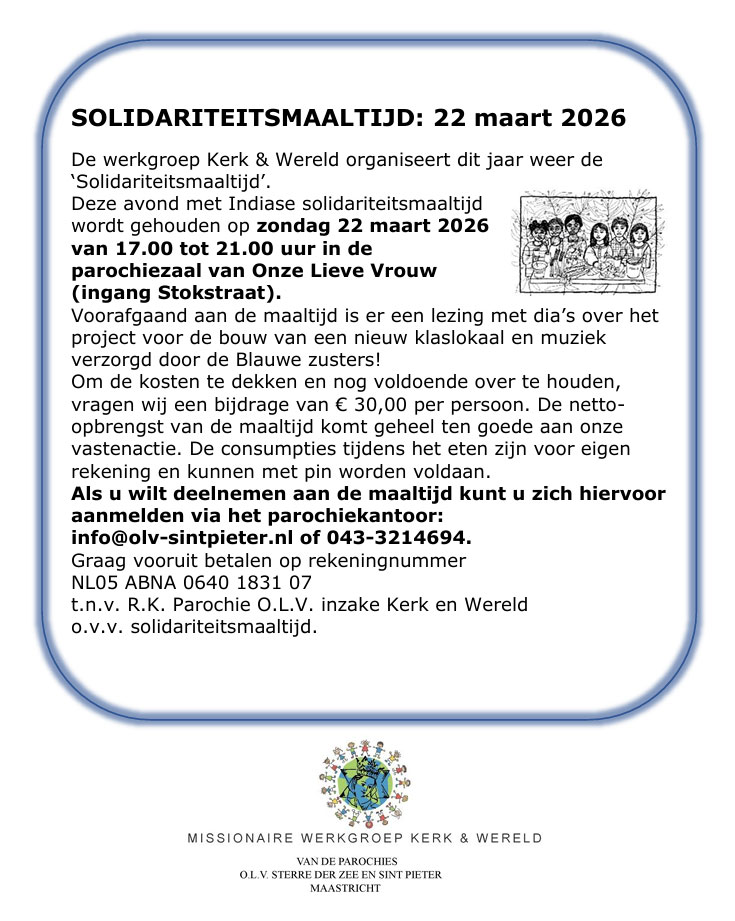 De werkgroep Kerk & Wereld organiseert dit jaar weer de Solidariteitsmaaltijd. Deze avond met Indiase solidariteitsmaaltijd wordt gehouden op zondag 22 maart van 17.00 tot 21.00 uur in de parochiezaal van Onze Lieve Vrouw (ingang Stokstraat). Voor het Vastenactie Project 2026 ‘Samen bouwen aan een nieuwe klas’ organiseert Kerk & Wereld een solidariteitsmaaltijd. Met jouw aanwezigheid help je mee om dit mooie initiatief te steunen. Let op: Het aantal plaatsen is beperkt, dus meld je tijdig aan om zeker te zijn van een plaats.