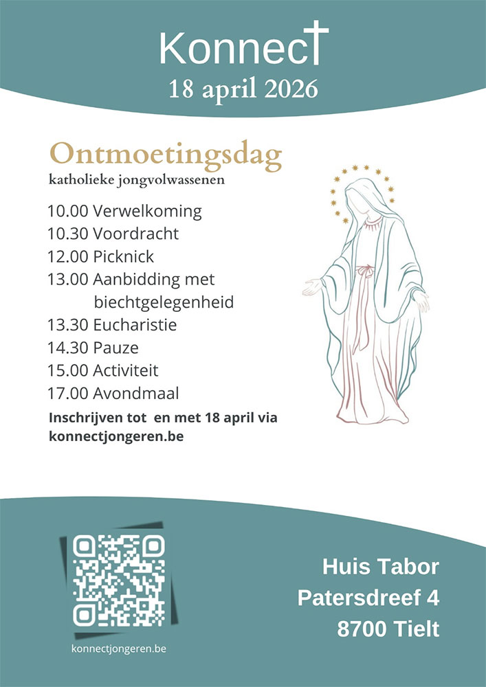 Een dag vol geloof, verbinding en verdieping: een voordracht over de Verrijzenis, aanbidding, een Mariamis en een creatieve buitenactiviteit in Tielt. Programma We voorzien soep bij het middag- en avondeten - breng wel je eigen picknick mee! Of je nu gelooft, twijfelt of gewoon nieuwsgierig bent: je bent van harte welkom. Inschrijven t/m 18 april via www.konnectjongeren.be