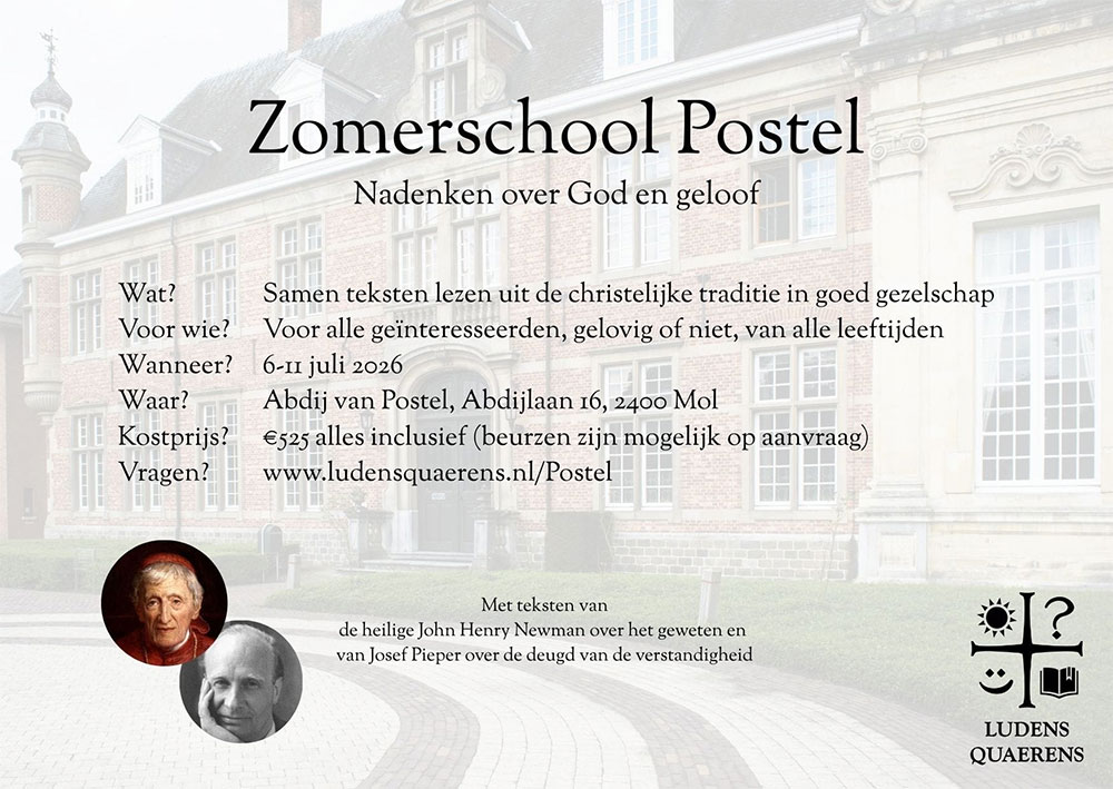 Houd je van nadenken over God en het geloof en praat je daar graag met anderen over? Kom dan deze zomer naar de zomerschool van Ludens Quaerens in de abdij van Postel (Noord-België). Een week lang lees en bespreek je samen inspirerende teksten van grote christelijke denkers, in de rust van een prachtige abdij. Met dagelijkse Mis, een excursie, interessante gastsprekers en natuurlijk tijd voor ontspanning.