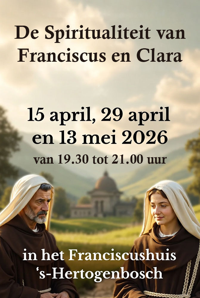 Fer van der Reijken ofm, Beatrijs Corveleyn osc en Michel Versteegh ofs leiden ons in op drie woensdagavonden in de spiritualiteit van Franciscus en Clara. Je wilt dienstbaar zijn aan je medemensen. Je wilt onbezorgd onthecht aan bezit leven. Je houdt niet op om naar vrede te streven. Dan heb je wellicht behoefte aan mensen aan wie je je kunt spiegelen, mensen die je tot voorbeeld kunnen zijn. Franciscus en Clara van Assisi waren zulke mensen. We verdiepen ons in de levens van Franciscus en Clara en denken samen na over geleefde franciscaanse spiritualiteit in het dagelijkse leven. De bijeenkomsten vinden plaats in het Franciscushuis van het Stadsklooster San Damino gelegen te Van der Does de Willeboissingel 11, ’s-Hertogenbosch op: