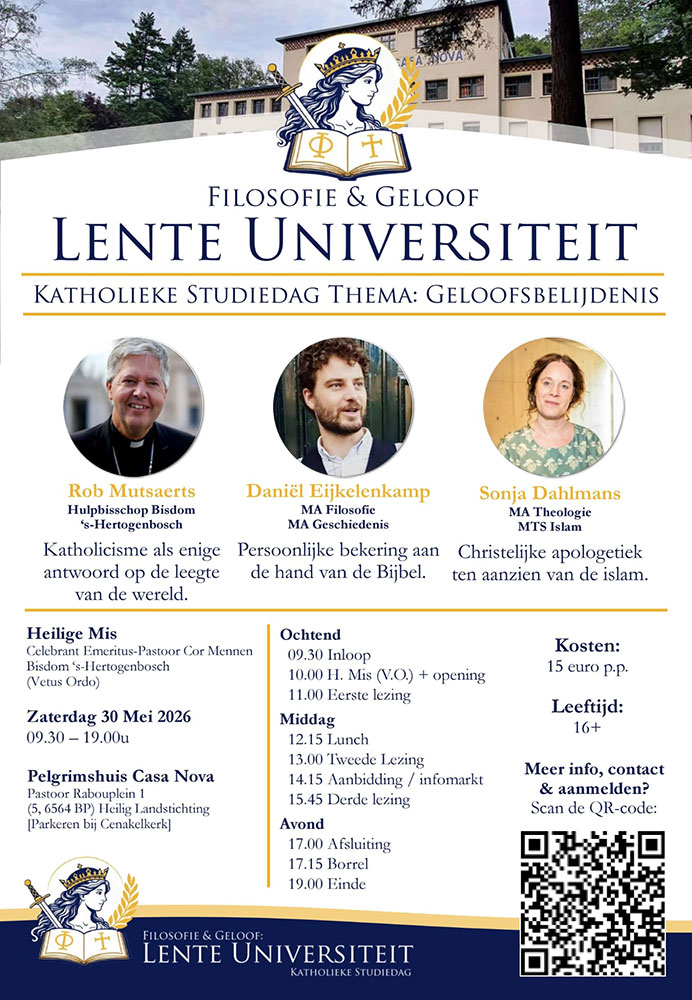 Gedurende de dag is er volop ruimte voor ontmoeting en verdieping, met een verzorgde lunch (inbegrepen), een informatiemarkt, aanbidding met rozenkransgebed en gelegenheid tot biecht, en we sluiten af met een borrel vanaf 17 uur. Over ons Inschrijven Je inschrijving is definitief na betaling. Aanmelden via dit formulier: