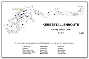 Rond Kerst 2010 wordt voor het vijftiende achtereenvolgende jaar de kerststallenroute in Baarn georganiseerd. In ruim zestig Baarnse tuinen staan kerststallen, die zichtbaar zijn vanaf de openbare weg. Men kan de route bij voorkeur lopend en fietsend, of eventueel per auto afleggen. De kerststallenroute kent een grote variatie: stallen, schilderijen, wandkleden, kinderkerststallen, etcetera. Deze kerststallen en kersttaferelen zijn voor het overgrote deel zelf door de deelnemers gemaakt.