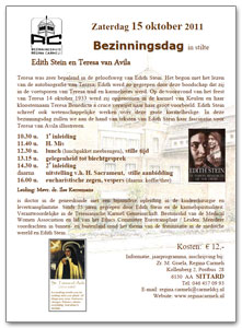 beschrijving | ![]() Edith Stein en Teresa van Avila Teresa was zeer bepalend in de geloofsweg van Edith Stein. Het begon met het lezen van de autobiografie van Teresa. Edith werd zo gegrepen door deze boodschap dat zij in de voetsporen van Teresa trad en karmelietes werd. Op de vooravond van het feest van Teresa 14 oktober 1933 werd zij opgenomen in de karmel van Keulen en haar kloosternaam Teresa Benedicta a cruce verwijst naar haar groot voorbeeld. Edith Stein schreef ook wetenschappelijke werken over deze grote karmelheilige. In deze bezinningsdag zullen we aan de hand van teksten van Edith Stein haar fascinatie voor Teresa van Avila illustreren. Programma
