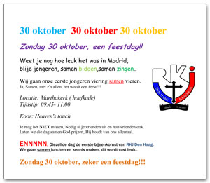Ter ere van de officiële oprichting van RKJ Den Haag zal er op 30 oktober a.s. een viering om 09.45 u. plaatsvinden in de H. Marthakerk, Hoefkade 623 Den Haag.