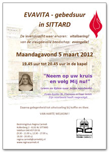 De levenskracht weer ervaren: vitalisering! “Neem op uw kruis en volg Mij nu!” Leven en lijden naar Jezus voorbeeld… Zoals Zuster M. Theresia in haar leven Zijn voorbeeld heeft nagevolgd. Daarna gelegenheid tot uitwisseling bij koffie en thee.
