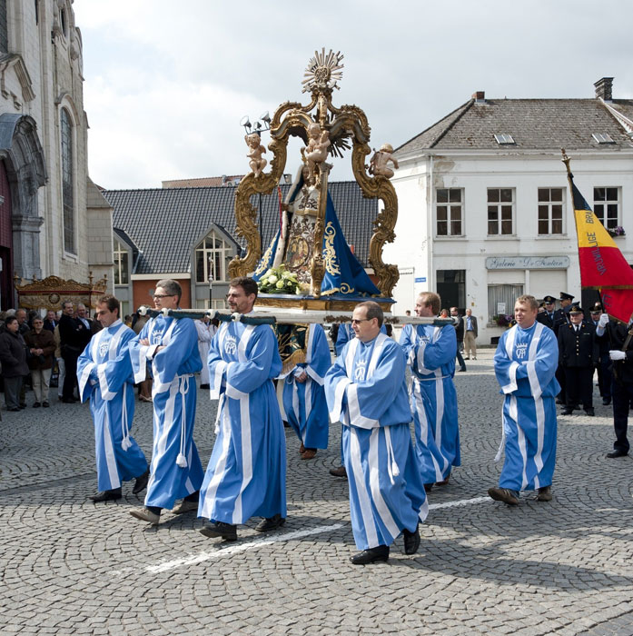 beschrijving | ![]() Dit jaar zal de 141ste “Bid-en Boeteprocessie” doorgaan op donderdag 17 mei 2012 om 15.00u. We verzamelen tegen bovenstaand uur aan de Dekenale Onze Lieve Vrouw Geboorte-kerk in Lebbeke. Doorheen de straten van Lebbeke gaat het beeld van Onze-Lieve-Vrouw uit terwijl er gebeden wordt. De plechtigheid wordt afgesloten met een lof in open lucht op het gemeenteplein. De devotie van Maria is zeer groot, want Lebbeke is de oudste bedevaartsoord van het bisdom Gent. Een mooi en krachtig hulde lied - Rijs Maria 1. Rijs Maria hier in glorie op uw uitverkoren grond. Refr.: Gegroet, gegroet, gegroet o Moedermaagd,