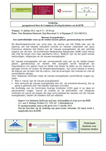 De studiedag van de Commissie Overleg Instituten (COI) gaat in op deze en aanverwante vragen. Vanuit de traditie en de werkvelden van religieuze instituten en vanuit de scepsis die daar soms bestaat ten aanzien van de ‘nieuwe evangelisatie’, bieden de inleiders stof tot reflectie. Opgave voor deelname (liefst) per mail aan s.hobeijn@knr.nl of per post aan KNR, Aan het bijwonen van de studiedag zijn geen kosten verbonden.