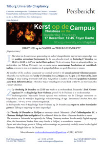 beschrijving | ![]() Op donderdag 24 december om 23.00 uur wordt er in studentenkerk ‘Maranatha’ (Prof. Cobben-hagenlaan 19) een Engelstalige Kerst-Nachtmis gevierd. Na de Nachtmis is er een kerstontbijt. Studentenparochie ‘Maranatha’ bestaat speciaal voor studenten van de Tilburgse universiteit en hogescholen, maar de wekelijkse Engelstalige eucharistieviering, de zgn. International Student Mass, elke zondag om 17.00 uur, is voor iedereen toegankelijk. In het bijzonder voor de Engelstalige Kerst-Nachtmis op 24 december zijn expats en andere buitenlandse gasten in Tilburg en omgeving van harte uitgenodigd.