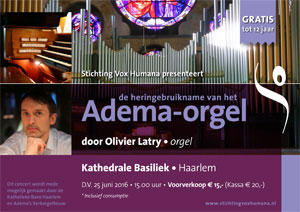 beschrijving | ![]() Op zaterdag 25 juni 2016 vanaf 15.00 uur wordt een speciaal zaterdagmiddagconcert gegeven in de Kathedrale Basiliek van Sint Bavo te Haarlem. Organist Olivier Latry zal het Adema-orgel weer ingebruiknemen. Programma: