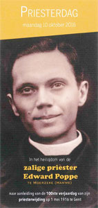 beschrijving | ![]() Naar aanleiding van de 100ste verjaardag van de priesterwijding van priester Edward Poppe op 1 mei 1916 te Gent organiseert de V.Z.W. Priester E. Poppecomité een priesterdag in het heiligdom. Programma Ten laatste inschrijven vóór 3 oktober a.s. met vermelding: Inschrijving priesterdag Deelnameprijs: 22 eurro