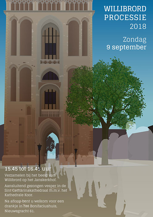 De zestiende editie van de jaarlijkse Willibrordprocessie door de binnenstad van Utrecht vindt plaats op zondag 9 september 2018. De Willibrordprocessie “is een gebeuren waarbij we publiekelijk getuigenis afleggen van ons geloof. Het motto is ook dit jaar: ‘Geloof mag gezien worden’,” aldus pastoor Boogers van de organiserende Salvatorparochie. Het pastoraal team van de Salvatorparochie nodigt alle gelovigen, jong en oud, uit om deel te nemen aan deze processie. Pastoor Boogers: “Met de schrijn van Willibrord in ons midden groeperen wij ons rond de Apostel van Nederland. Samen laten wij in vrijheid de vreugde van ons geloof zien. De processie getuigt van onze verbondenheid met Christus, met elkaar en met allen die in Zijn geest leiding geven aan de christelijke gemeenschap. Wij hopen dat de Willibrordprocessie voor alle deelnemers alsook voor de stad Utrecht en alle christenen in ons land een blijde geloofsgetuigenis mag zijn. Wij tonen hiermee aan dat wij geen gemeenschap vormen die in zichzelf opgesloten is, maar dat wij leven vanuit een geloof dat – letterlijk – de straat op durft te gaan, opdat velen Jezus Christus en Zijn Evangelie mogen kennen, in verbondenheid met heel de Kerk, in navolging van Willibrord.” Deelnemers aan de processie verzamelen zich om 15.45 uur rond het beeld van de H. Willibrord op het Janskerkhof. Om 15.50 uur volgt het opstellen op het Janskerkhof, waarna om 16.00 uur de processie begint. Bij het passeren van de processie zullen de klokken van de protestantse Domtoren luiden. De stoet vervolgt de route via het Domplein richting de St. Catharinakathedraal (Lange Nieuwstraat 36), waar rond 16.45 uur de afsluitende vesperviering is. Na afloop zijn alle processiegangers welkom voor koffie en een glas om gezamenlijk dit gebeuren af te sluiten in het Bonifaciushuis (Nieuwegracht 61, de voormalige pastorie achter de kathedraal). Priesters, diakens en pastoraal werk(st)ers die meelopen, zijn vanaf 15.00 uur welkom in het Ariënsinstituut (Keistraat 9), waar zij zich ook kunnen omkleden. Zij stellen zich om 15.45 uur in de Keistraat achter de schrijn op en lopen in stille processie naar het Janskerkhof. De achtergelaten kleding zal naar de sacristie van de kathedraal worden gebracht.