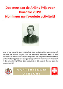 De Ariëns Prijs voor Diaconie 2019 wordt op 12 oktober voor de zesde keer uitgereikt. Tot 10 oktober kan nog gestemd worden voor de publieksprijs (klik hier). Op dit moment worden de boekjes ‘Je moet het zien’ verspreid binnen het Aartsbisdom Utrecht. Hierin staan alle 31 genomineerden voor de Ariëns Prijs voor Diaconie beschreven. Ook bevat deze bundel een theologisch commentaar door de jury. Inmiddels is ook het programma van de dag vastgesteld. De prijsuitreiking vindt plaats in het Titus Brandsmahuis (Titus Brandsmaplein 2 Deventer). De toegang van deze dag is gratis, in verband met de lunch graag aanmelden bij: info@dkci-utrecht.nl Programma