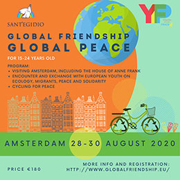 De Global Friendship Europese ontmoeting die gepland stond in augustus 2020 is vanwege de coronamaatregelen uitgesteld tot 2021. Zodra de exacte data bekend zijn, zullen we die op deze website publiceren. Van 28 tot en met 30 augustus 2020 ontmoeten jongeren uit heel Europa elkaar in Amsterdam voor ‘Global Friendship, Global Peace’. Het is de tiende keer dat Sant’ Egidio deze internationale jongerenbijeenkomst organiseert. Het zijn drie dagen van uitwisseling en ontmoeting tussen jongeren uit verschillende landen, waarin zij thema’s als vrede, solidariteit, ecologie en migratie bespreken. Ook bezoeken de jongeren het Anne Frankhuis en is er een fietstocht voor de vrede. Global Friendship draagt bij aan een cultuur van vrede en helpt zo jongeren van de Europese beweging ‘Youth for Peace’ om hun stad menselijker te maken, om te beginnen door de solidariteit met de armste en meest kwetsbare bewoners. Voor jongeren van 15 tot en met 24 jaar.