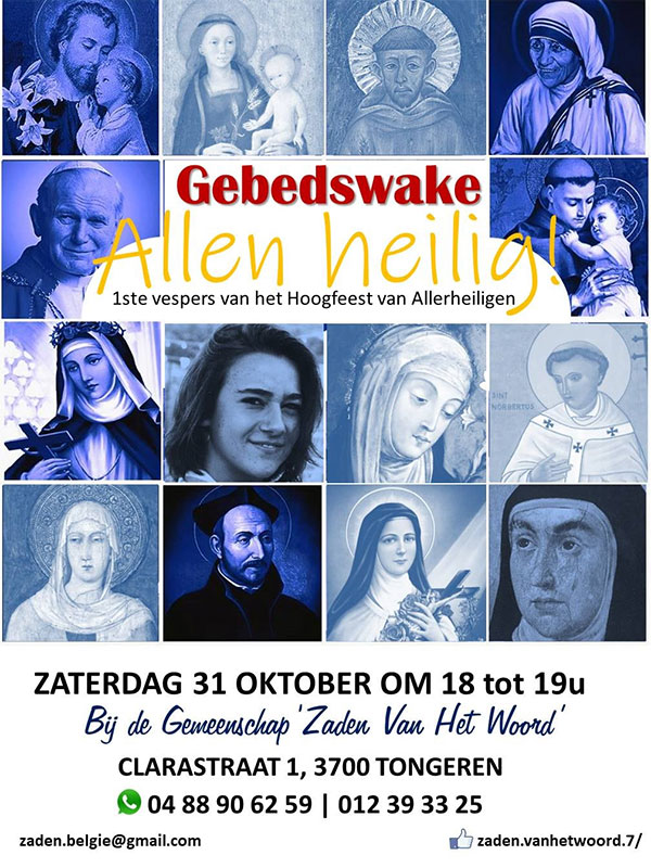 beschrijving | ![]() Op zaterdag 31 oktober 2020 wordt bij de Gemeenschap ‘Zaden van het Woord’ een gebedswake gehouden van 18.00 tot 19.00 uur. We bidden de eerste Vespers van het Hoogfeest van Allerheiligen.