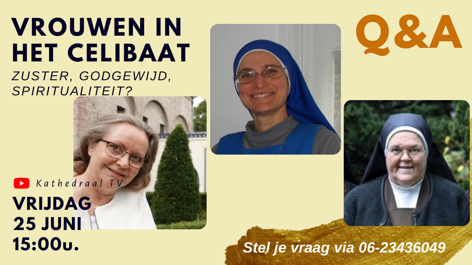 Priesters leven celibatair, ze trouwen niet en hebben geen gemeenschap. Ook kun je als vrouw tot het celibaat geroepen zijn via het zusterschap, toegewijd leven of als Godgewijde maagd. Als zuster kun je actief of contemplatief leven, je kunt als toegewijde leek je leven volledig aan God geven en op de werkvloer en midden in de maatschappij staan. Er zijn vele manieren om een toegewijd leven te leiden. Vrijdag 25 juni gaat Kathedraal TV van Bisdom Haarlem-Amsterdam in gesprek met zr. Elvira Maria van de Karmelietessen en toegewijd leek Lisette van Oordt van de Emmanuel gemeenschap. Stel je vraag over hun roepingen, motivatie en hoe deze keuze hun heeft geholpen via WhatsApp: 06 23436049 of live in de chat op YouTube!