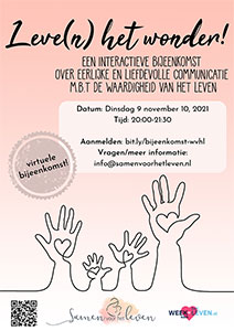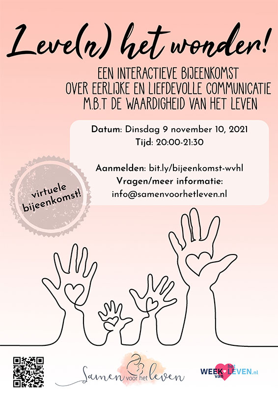 Van 6-13 november vindt weer de jaarlijkse Week van het Leven plaats. Tijdens deze week wordt door het hele land aandacht gevraagd voor en besteed aan de waardigheid van het leven. Om concrete handvaten te geven hier in je dagelijks leven mee aan de slag te gaan organiseren wij in de Week van het Leven op dinsdag 9 november de interactieve bijeenkomst ‘Leve(n) het wonder!’ In deze interactieve bijeenkomst wordt aan de hand van verschillende videofragmenten van Canadeese Pro-Life spreekster Stephanie Gray Connors aandacht besteed aan eerlijke en liefdevolle communicatie m.b.t. de waardigheid van het leven. Aanmelden