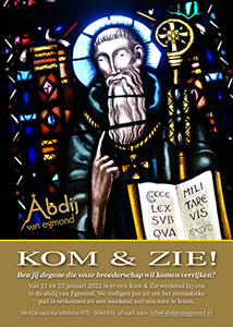 beschrijving | ![]() Van vrijdag 21 t/m zondag 23 januari 2022 is er een Kom & Zie weekend in de Abdij van Egmond. De abdijgemeenschap nodigt jou uit om het monastieke pad te verkennen en een weekend met hen mee te leven.
