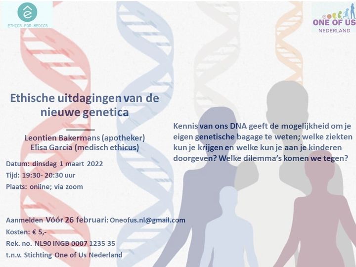 Kennis van ons DNA geeft de mogelijkheid om je eigen genetische bagage te weten; welke ziekten kun je krijgen en welke kun je aan je kinderen doorgeven? Welke dilemma’s komen we tegen? Aanmelden vóór 26 februari: oneofus.nl@gmail.com