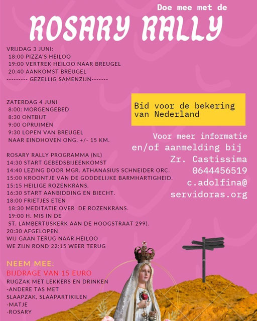 De Blauwe Zusters van Heiloo gaan deelnemen aan de Rosary Rally op zaterdag 4 juni in Eindhoven. We verzamelen op vrijdagavond 3 juni om 18.00 uur in Heiloo. Overnachten is gepland in Breugel, net boven Eindhoven. Zaterdagochtend gaan we zo’n 15 km lopend van Breugel naar Eindhoven. Zaterdagmiddag sluiten we aan bij het programma van de Rosary Rally en ’s avonds reizen we weer terug naar Heiloo. Bid voor de bekering van Nederland. Programma Vrijdag 3 juni Zaterdag 4 juni Rosary Rally programma Avondprogramma Meenemen