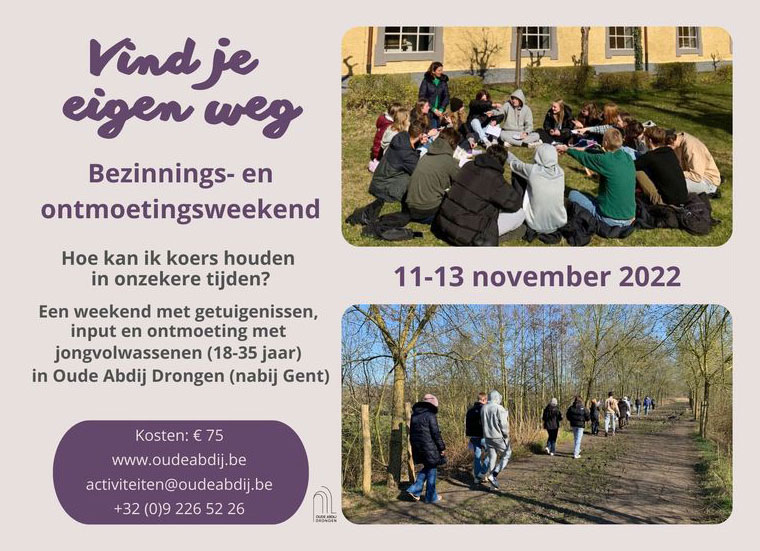 In het weekend van 11 t/m 13 november 2022 houdt Oude Abdij Drongen een bezinnings- en ontmoetingsweekend voor jongeren van 18 t/m 35 jaar. Hoe kan ik koers houden in onzekere tijden? Een weekend met getuigenissen, input en ontmoeting met jongvolwassenen.