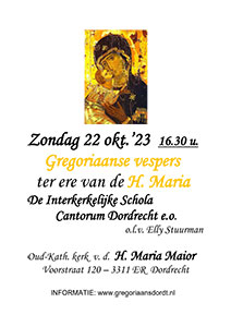 beschrijving | ![]() Op Zondag 22 oktober 2023 om 16.30 uur bidt en zingt de ‘Interkerkelijke Schola Cantorum Dordrecht En Omstreken’ o.l.v. Elly Stuurman de gregroriaanse Vespers ter ere van Maria. Plaats: de Oud-Katholieke kerk van de H. Maria Maior, Voorstraat 120, 3311 ER Dordrecht. De duur is ongeveer 1 uur. Boekjes met de Nederlandse en Latijnse tekst worden voor de duur van de viering aan de bezoekers ter beschikking gesteld. Er zal een eindcollecte worden gehouden. Allen van harte welkom! Attentie: sinds juni 2023 hebben we een nieuw webadres: www.grogoriaansdordt.nl