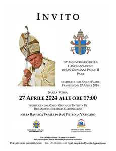 Op zaterdag 27 april 2024 om 17.00 uur wordt de tiende verjaardag gevierd van de heiligverklaring van paus Johannes Paulus II op het Sint-Pietersplein te Vaticaanstad.