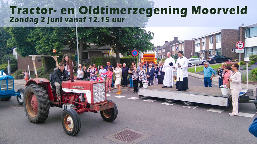 Na een aantal jaren van afwezigheid zullen dit jaar de tractoren en oldtimers weer gezegend gaan worden en wel op zondag 2 juni 2024. De Tractor- en Oldtimerzegening zal aansluitend aan de processie plaatsvinden voor de kerk van Moorveld. Het beoogde tijdstip is ca. 12.15 uur.