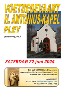 Voetbedevaart naar de Antoniuskapel in Pley. Vertrek vanuit het kerkplein Maria ten Hemelopneming in Chevremont Kerkrade. Nassastraat 37.