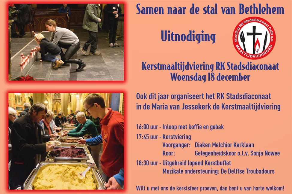 Ook dit jaar organiseert het RK Stadsdiaconaat in de Maria van Jessekerk de Kerstmaaltijdviering. Dit jaar is dat op woensdag 18 december vanaf 16.00 uur. Tijdens het kerstbuffet is er muzikale ondersteuning van De Delftse Troubadours.