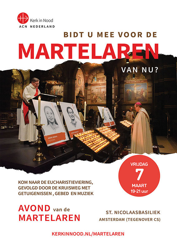 Op vrijdag 7 maart 2025 gedenken we de mensen die in 2024 zijn gedood om hun geloof in Christus. Aansluitend aan de Eucharistieviering om 19 uur, bidden we samen de kruisweg met muziek en getuigenissen. Met bisschoppen en priesters die de Eucharistieviering voorgaan, prachtige muziek en indrukwekkende getuigenissen, is de Avond van de Martelaren een plechtig moment om vervolgde christenen te gedenken. U bent van harte uitgenodigd! We vernemen graag of (en met hoeveel personen) u komt via steun.kerkinnood.nl/avond-van-de-martelaren/ of telefoonnummer 073-613 08 20. Dit jaar gedenken we onder meer pater Marcelo Pérez uit Mexico. Zijn inzet voor inheemse gemeenschappen veroorzaakte veel ongemak bij zowel machthebbers als criminele bendes. ”Ik heb gevochten tegen onrechtvaardigheid, we hebben gevochten voor vrede, maar ze hebben een prijs op mijn leven gezet”, zei de Jezuïet. Ondanks bedreigingen, weigerde hij te stoppen: “We hebben een goddelijk mandaat om mensenrechten en het leven te verdedigen.” Enkele maanden later werd hij vermoord. Kom ook op 7 maart naar de Sint Nicolaasbasiliek in Amsterdam en bid vanaf 19 uur mee: voor de zielenrust van martelaren als pater Pérez, voor kracht en troost voor hun nabestaanden en voor inkeer voor hun vervolgers.