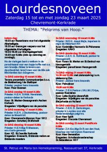 Van zaterdag 15 t/m zondag 23 maart 2025 organiseert de St. Petrus en Maria Tenhemelopnemingkerk te Chevremont-Kerkrade een Lourdesnoveen.