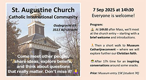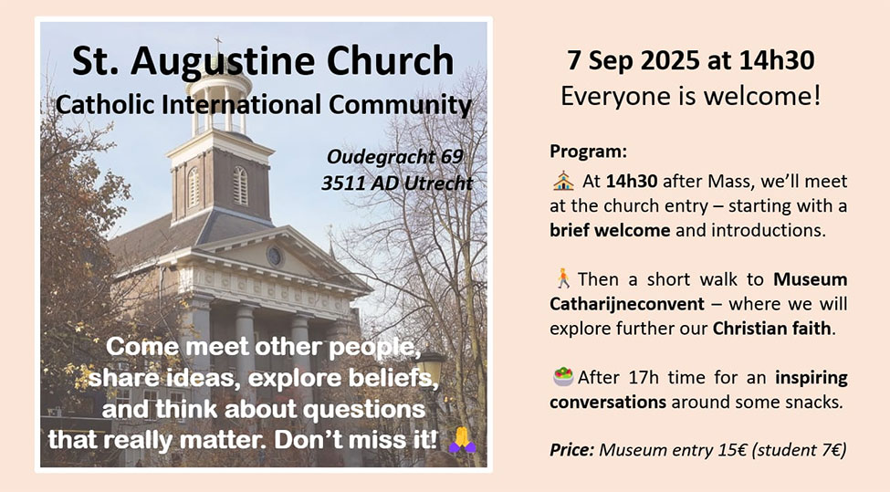 English Holy Mass starts at 12:45h. After Mass we gather in the Church entry with a brief welcome and introductions. Then we will walk to Museum Catharijneconvent where we will explore further out christian faith. After 17:00h there will be time for inspiring conversions around some snacks.