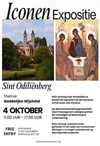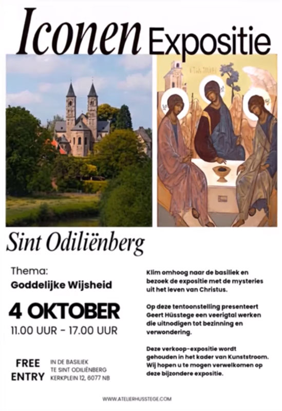 Kom kijken, kom ervaren. Iconen-expositie Sint Odiliënberg in de basiliek. Klim omhoog naar de basiliek en bezoek de expositie met de mysteries uit het leven van Christus. Op deze tentoonstelling presenteert Geert Hüsstege een veertigtal werken die uitnodigen tot bezinning en verwondering. Deze verkoop-expositie wordt gehouden in het kader van Kunststroom. Wij hopen u te mogen verwelkomen op deze bijzondere expositie.