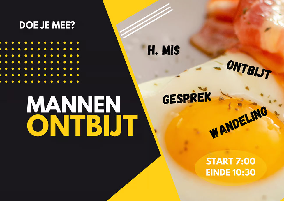 De H. Gerardus Majella Parochie te Utrecht organiseert elke zes weken op een zaterdagochtend het mannenontbijt. Deze activiteit duurt tot ongeveer half elf. Veel van de deelnemers hebben op zaterdag ook nog allerlei klussen te doen en dat is hierdoor prima mogelijk. Het doel is om ons als parochiaan in te zetten de vriendschap met Christus te verdiepen en te delen met elkaar, en om zo missionaire leerlingen te worden. Dit kan niemand alleen, daarom onder andere deze activiteit. Het blijkt heel inspirerend om samen over het geloof te praten, toegepast in ons dagelijks leven.