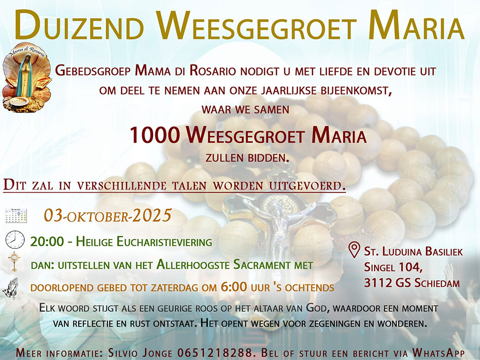 Gebedsgroep Mama di Rosario nodigt u met liefde en devotie uit om deel te nemen aan onze jaarlijkse bijeenkomst waar we samen duizend Weesgegroeten zullen bidden. Er zal in drie verschillende talen worden gebeden.