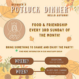 As usual, feel free to bring a snack, main dish, dessert, or drinks to share! You can drop your item in Jozefzaal before or after Mass.